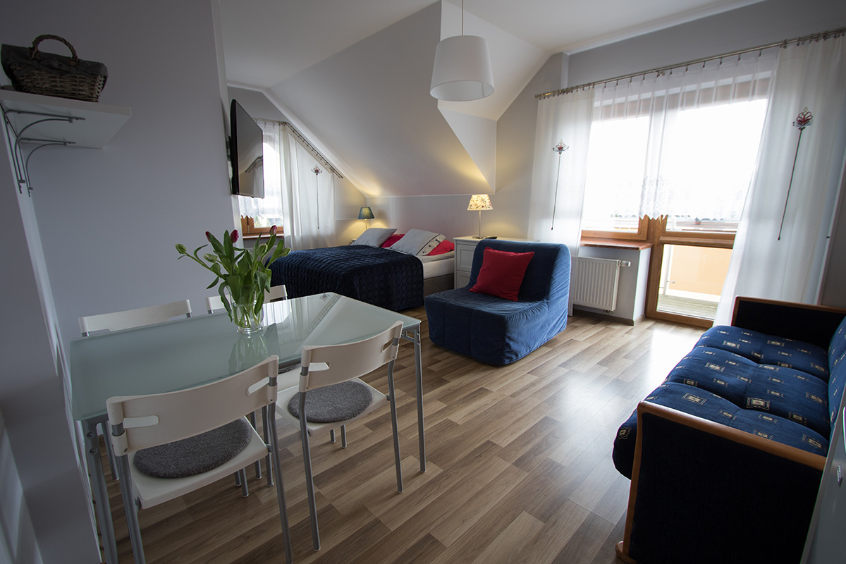 Do dyspozycji Gości także ogólnodostępny aneks kuchenny z akcesoriami, żelazko i deską do prasowania oraz taras z którego rozpościera się widok na Zatokę Pucką, Bałtyk i panoramę miasta. Na terenie posesji znajduje się altana z piłkarzykami, grill i miejsce do grillowania. Ponadto można bezpłatnie korzystać z internetu bezprzewodowego WiFi oraz miejsc parkingowych.